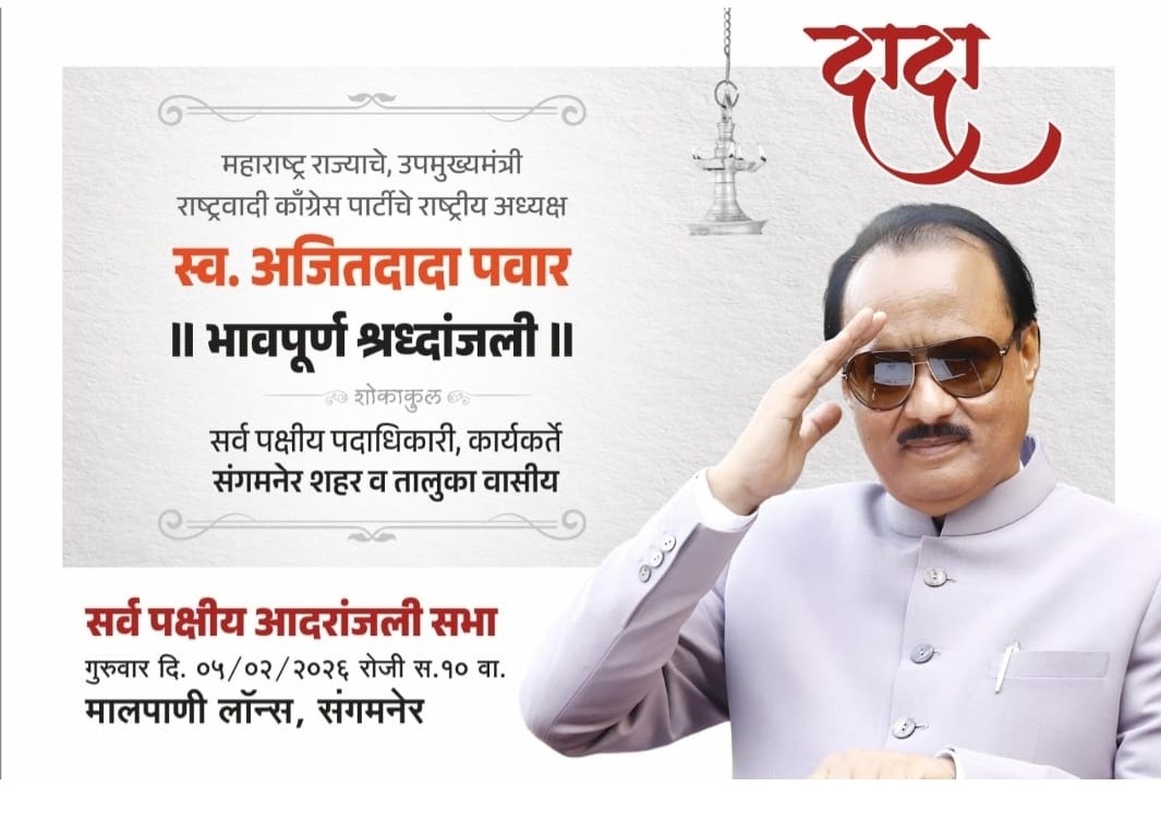 महाराष्ट्र राज्याचे उपमुख्यमंत्री तथा ज्येष्ठ नेते मा. अजितदादा पवार साहेब यांच्या दुःखद निधनाने संपूर्ण महाराष्ट्र शोकसागरात बुडाला आहे. त्यांच्या स्मृतीस आदरांजली अर्पण करण्यासाठी संगमनेर शहरात सर्वपक्षीय शोकसभेचे आयोजन करण्यात आले आहे.