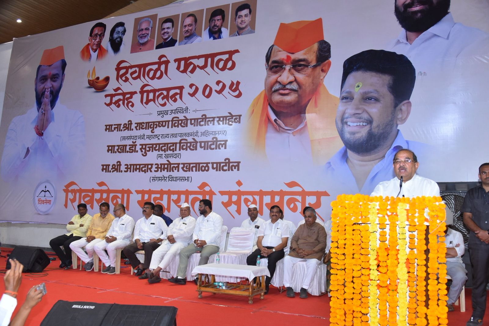आमदर.अमोल खताळ आणि महायुती च्या वतीने दिपावली स्नेहमिलन आणि दिवाळी फराळ कार्यक्रमाचे आयोजन करण्यात आले होते. यावेळी मंत्री विखे पाटील बोलत होते यावेळी थोर विचार वंत प्रा.एस.झेड देशमुख भाजपचे प्रदेश पदाधिकारी सुनील कर्जतकर शिवसेनेचे जालिंदर भोर ,जिल्हाप्रमुख कमलाकर कोते उपजिल्हाप्रमुख मारुती मेंगाळ जिल्हा संघटक विठ्ठल घोरपडे राष्ट्रवादीचे जिल्हाप्रमुख कपिल पवार शिवसेनेचे तालुकाप्रमुख रामभाऊ राहाणे राजेंद्र सोनवणे शहर प्रमुख दिनेश फटांगरे विनोद सूर्यवंशी भाजप ज्येष्ठ नेते सुदाम सानप बापूसाहेब गुळवे भीमराज चतर डॉ अशोक इथापे श्रीराम गणपुले जावेद जहागिरदार भाजप शहराध्यक्ष पायल ताजने भाजप युवा मोर्चा जिल्हाध्यक्ष रोहित चौधरी डॉ सोमनाथ कानवडे कैलास वाकचौरे आर पी आयचे तालुका ध्यक्ष आशिष शेळके, शहराध्यक्ष कैलास कासार शौकत जहागीरदार हरीश चकोर यांच्यासह पदाधिकारी कार्यकर्ते उपस्थित होते.मंत्री विखे पाटील यांनी संगमनेरी मिसळ आणि जिलेबीचा आस्वाद घेतला तसेच शहर आणि तालुक्यातील दहा ते बारा हजार सगमनेरकरांनी मिसळीचा आस्वाद घेतला